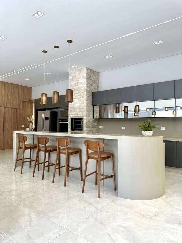 Além de compor o visual, os pendentes criam pontos de luz direcionada — ideais para bancadas, ilhas, mesas ou até áreas de preparo. Isso ajuda não só na estética, mas na segurança e no conforto visual durante o uso da cozinha.