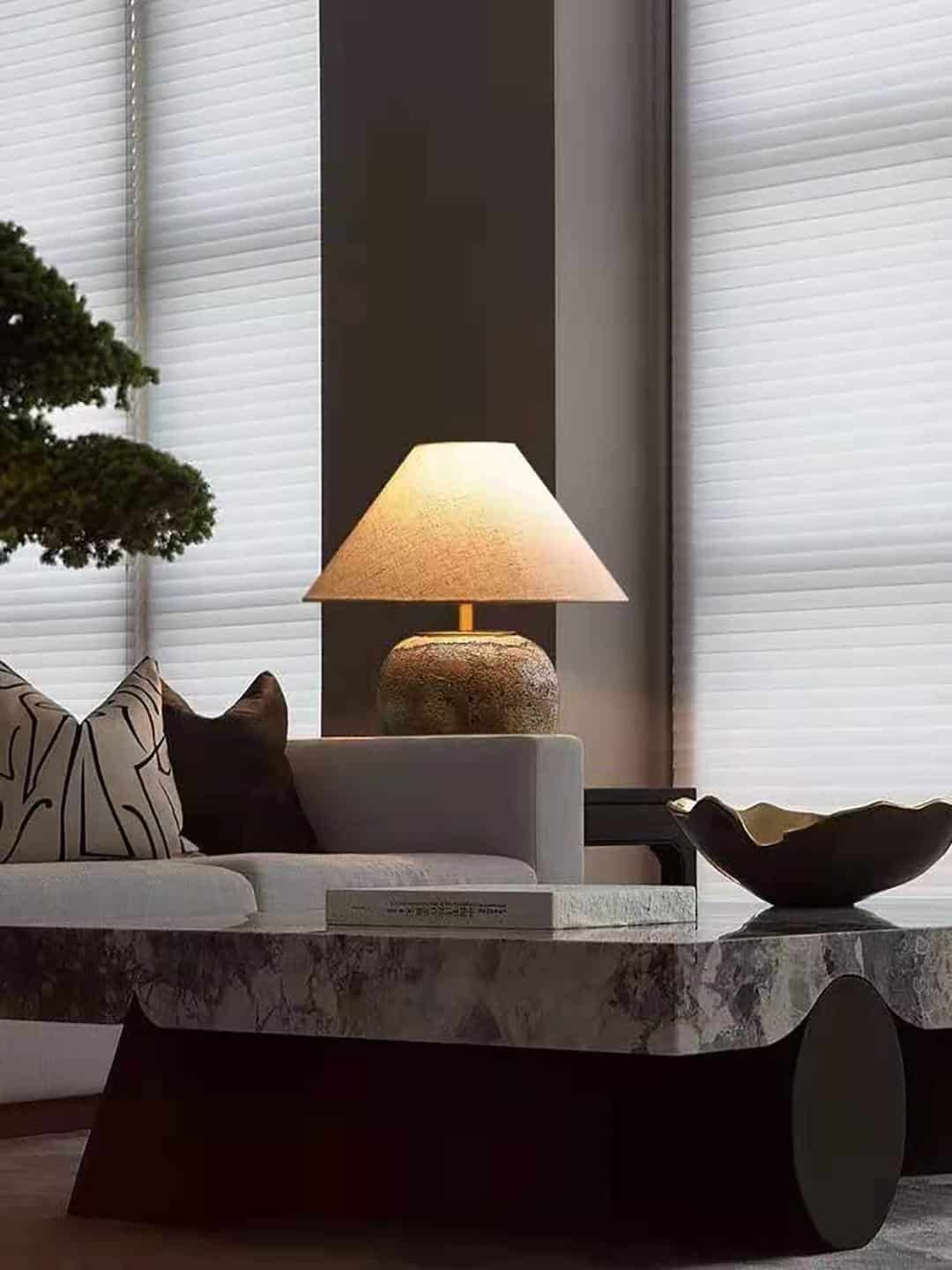 O Abajur argila wabi sabi pode ser usado em mesas de escritórios e home office para proporcionar uma iluminação agradável e decorativa.