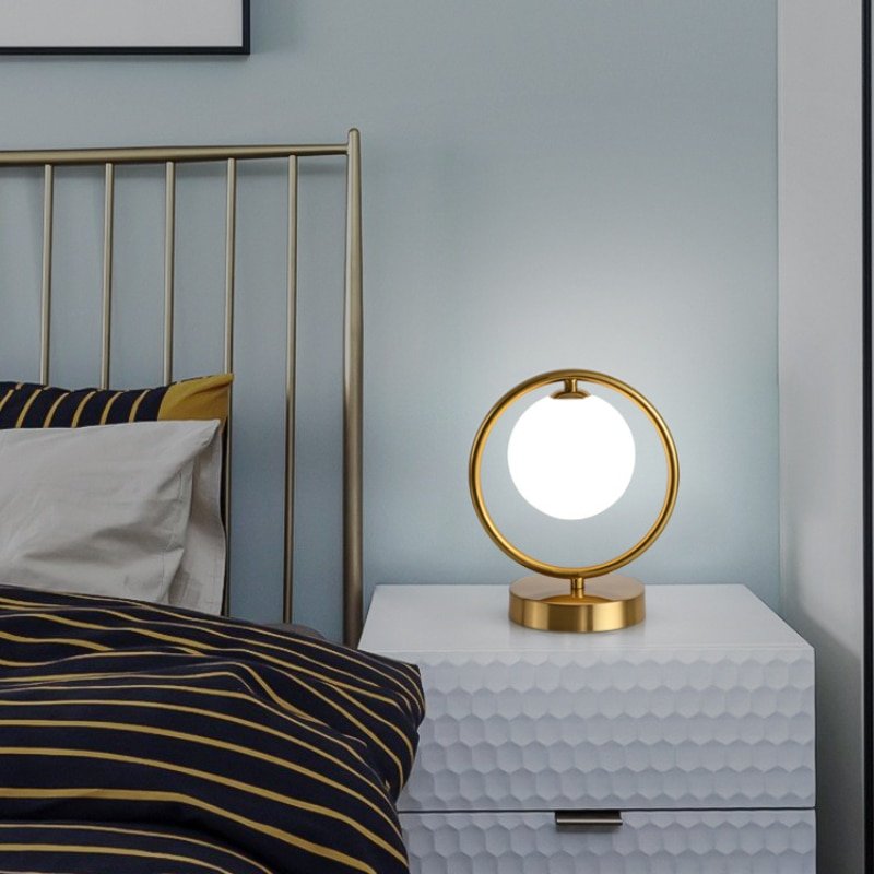 Luminária de mesa moderna minimalista aro/circulo/argola de alumínio dourado e bola/esfera de vidro leitoso