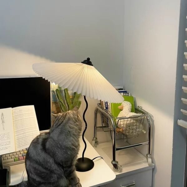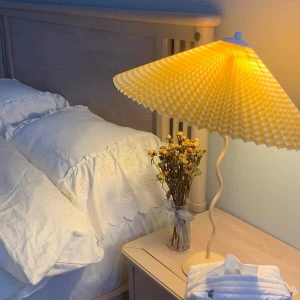 Luminária de mesa abajur de ferro forjado e cúpula formato de chapéu plissado. Para decoração em cabeceira de cama de quarto de casal ou mesa de apoio ao lado do sofá da sala e home office e escritórios para leitura ou trabalho.