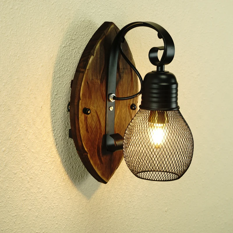 Arandela Base Madeira e Cúpula Aramada Preta