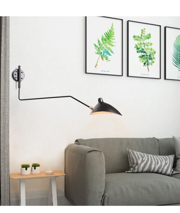 Antes de mais nada, a arandela replica Serge Mouille é feita com materiais de alta qualidade e é uma réplica fiel do design original de Mouille. Ao mesmo tempo, ela apresenta um braço curvo e uma sombra em forma de disco, ambas feitas de metal pintado em preto fosco, que criam uma aparência elegante e dramática. Porquanto, a sombra ajustada em diferentes direções para direcionar a luz onde for necessária, o que a torna uma ótima opção para iluminar paredes, quadros ou objetos decorativos por exemplo.