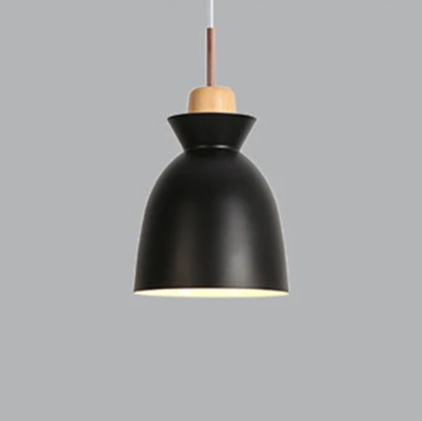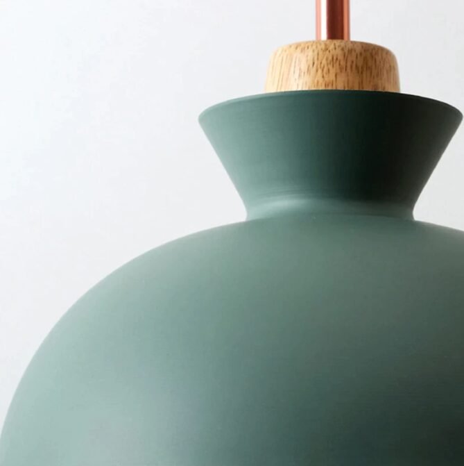 Pendente de alumínio pintado de verde, amarelo ou cinza e interno branco com detalhe superior em madeira e metal bronze
