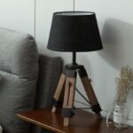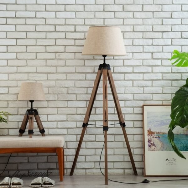 Luminária de piso tripé de madeira e cúpula cônica de tecido liso