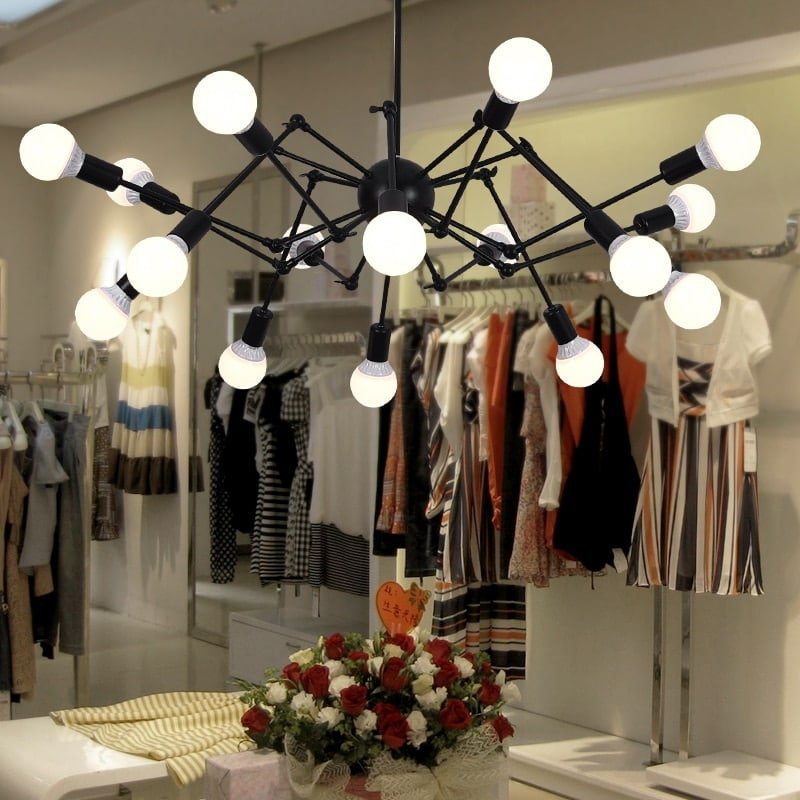 - Lojas: Para quem busca uma estética industrial para sua loja, o lustre Spider é uma escolha certeira. Ele é instalado no teto, acima do balcão de atendimento ou em outros pontos estratégicos da loja. Com toda a certeza, combinado com outros elementos industriais, como prateleiras de metal e paredes de tijolinhos, o resultado será surpreendente.