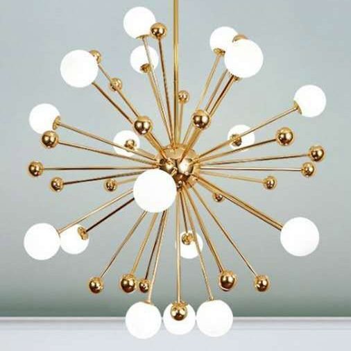 Lustre dourado molécula Sputinik com bolas de vidro branca leitosa