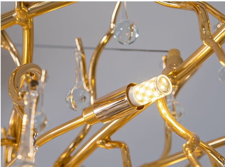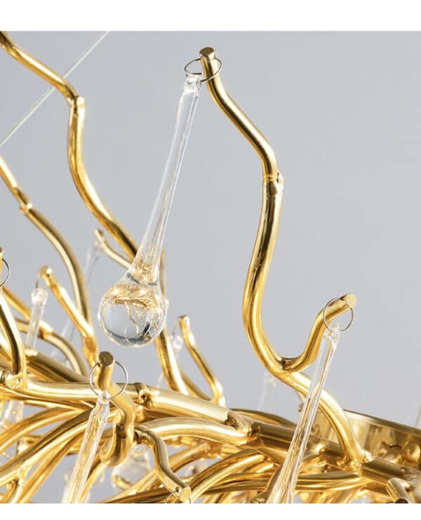 - Design único: A luminária Lustre Galho de Árvore e Gotas de Cristais Transparente tem um design único, com ramificações de alumínio que parecem galhos de árvores. Os cristais transparentes átrios nas ramificações refletem a luz, criando um efeito brilhante e elegante.