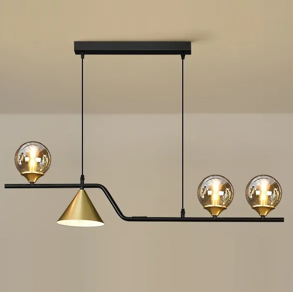 Lustre moderno contemporâneo retangular/comprida, com bolas de vidro e cúpulas cônicas