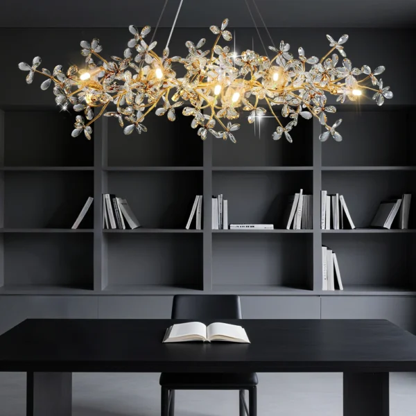 Com o Lustre Pendente Moderno Dourado com Cristais em Formato de Flores e Galhos, Ideal para Sala de Jantar, Estar e Escritório, você garante iluminação que valoriza o projeto sem comprometer espaço ou harmonia visual.
