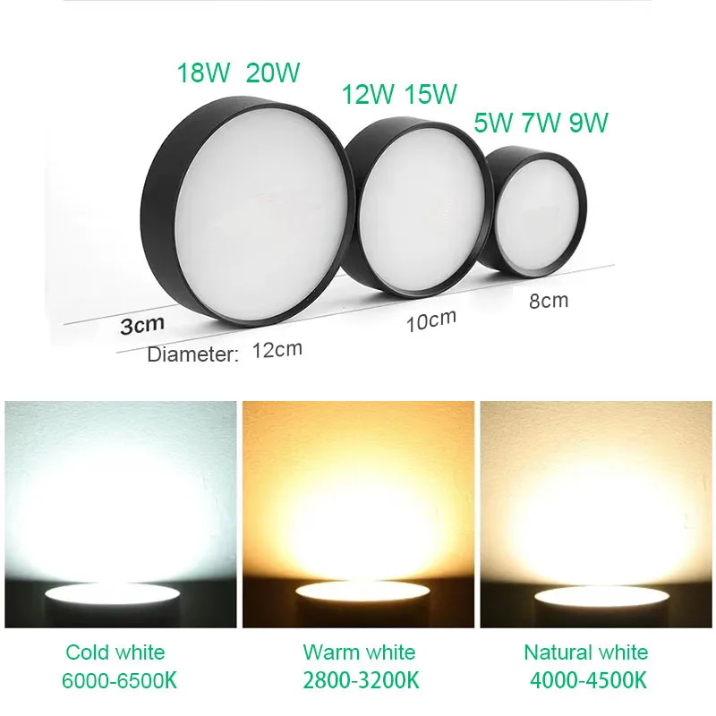 - 5W, 7W e 9W: diâmetro 80mm/altura 30mm