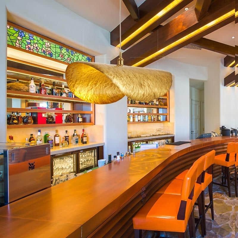 O Pendente pós-moderna luxo folha lótus é fixado no teto através de fios de aço e sua alimentação de energia se dá por fios.