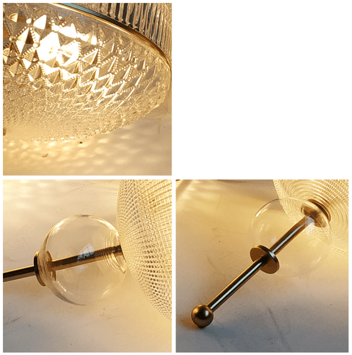 É uma luminária de vidro resistente a calor e outras variações de temperatura! tem acabamento liso interno e cravejado externo. O Metal é dourado polido.
