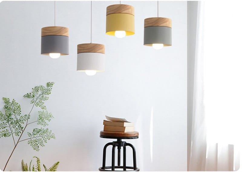 Pendente simples de alumínio colorido retrô com base de madeira