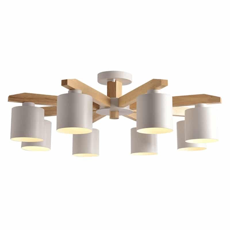Luminária de sobrepor, plafon de madeira e cúpulas de alumínio em forma de cilindro com luz de led