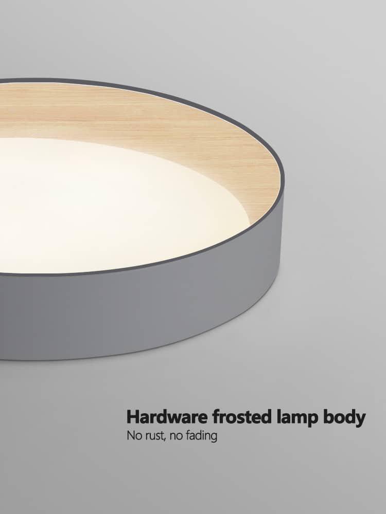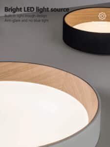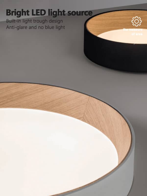 Luminária de sobrepor redondo moderno com bordas internas padrão madeira e difusor de acrílico branco leitoso