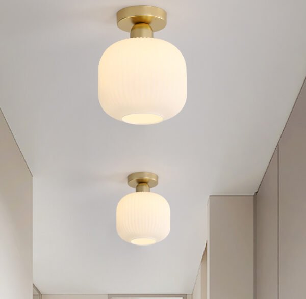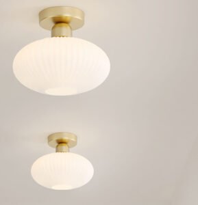 Luminária de sobrepor de vidro branco leitoso redondo com acabamento plissado e meta dourado