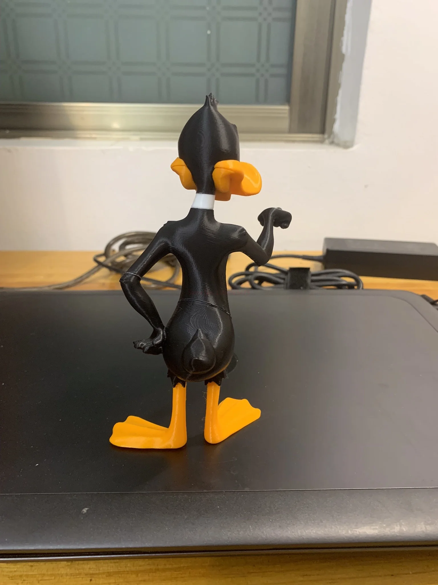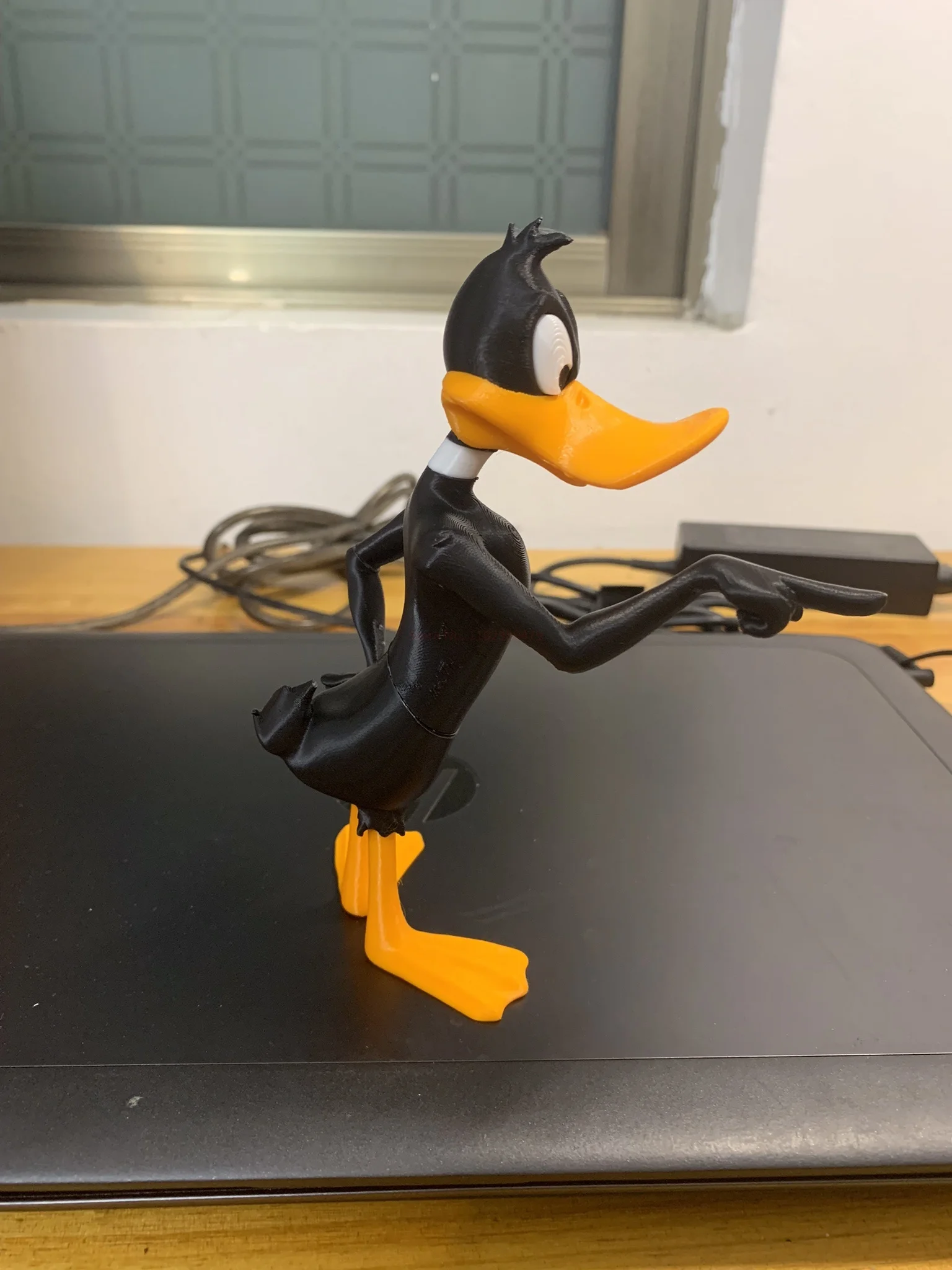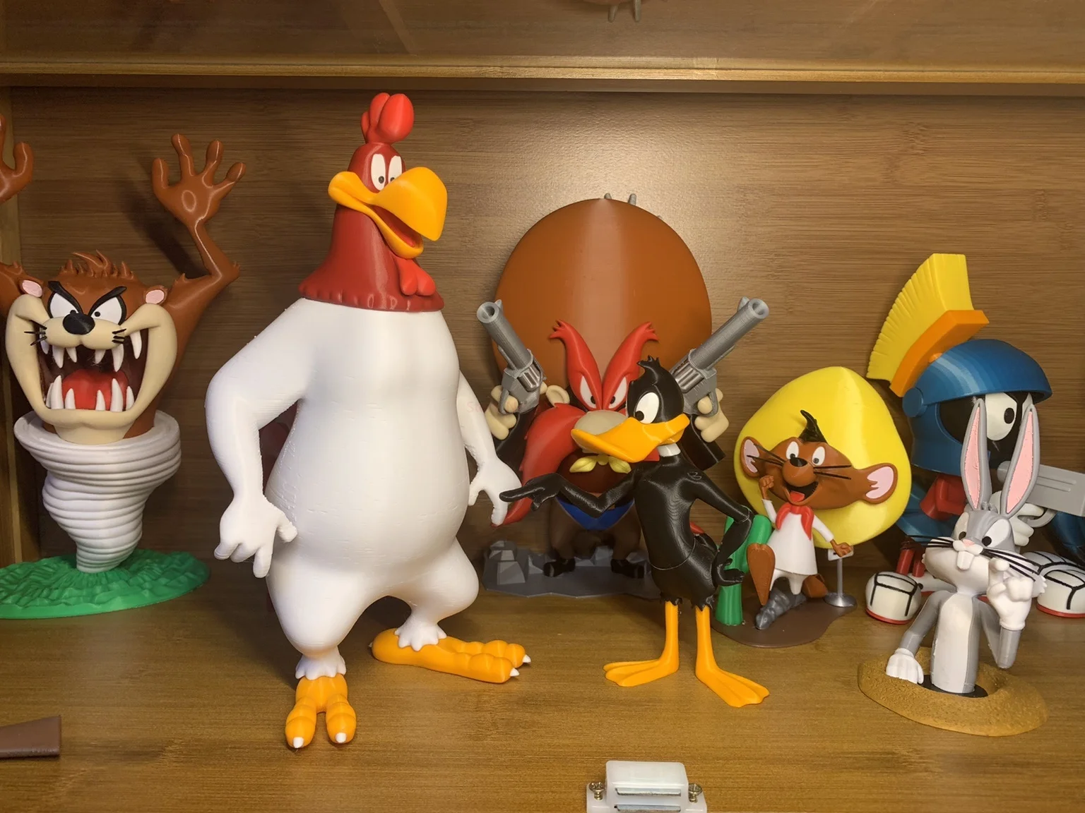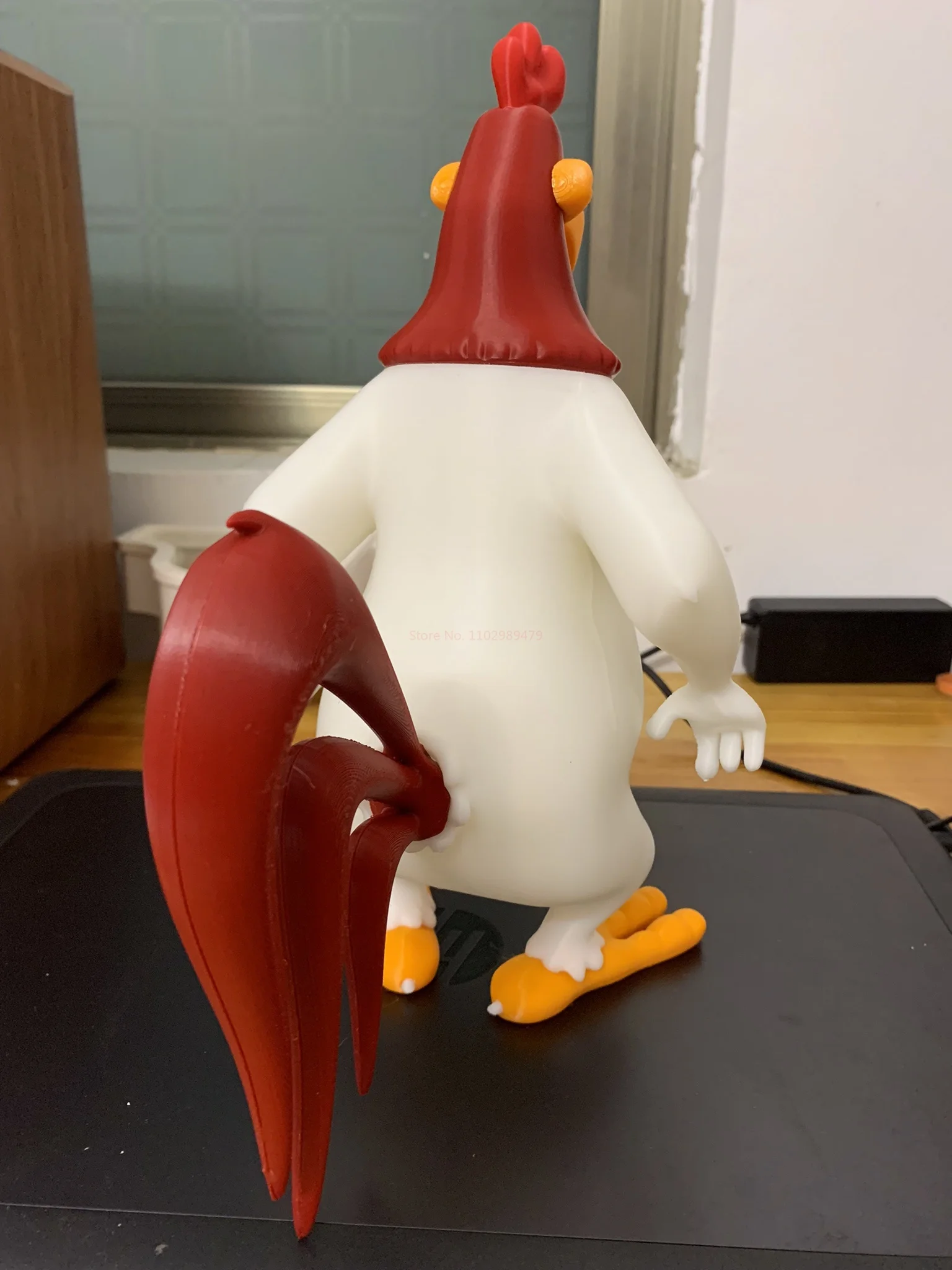A altura do frango Laiheng é de 27 centímetros e a altura do pato Daffy é de 17 centímetros