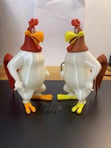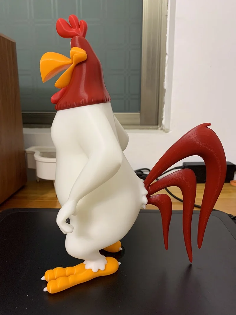 A altura do frango Laiheng é de 27 centímetros e a altura do pato Daffy é de 17 centímetros